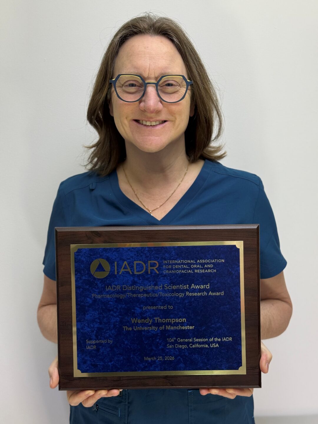 Dr Wendy Thompson FCGDent with the plaque commemorating her IADR Distinguished Scientist Award for Pharmacology, Therapeutics and Toxicology