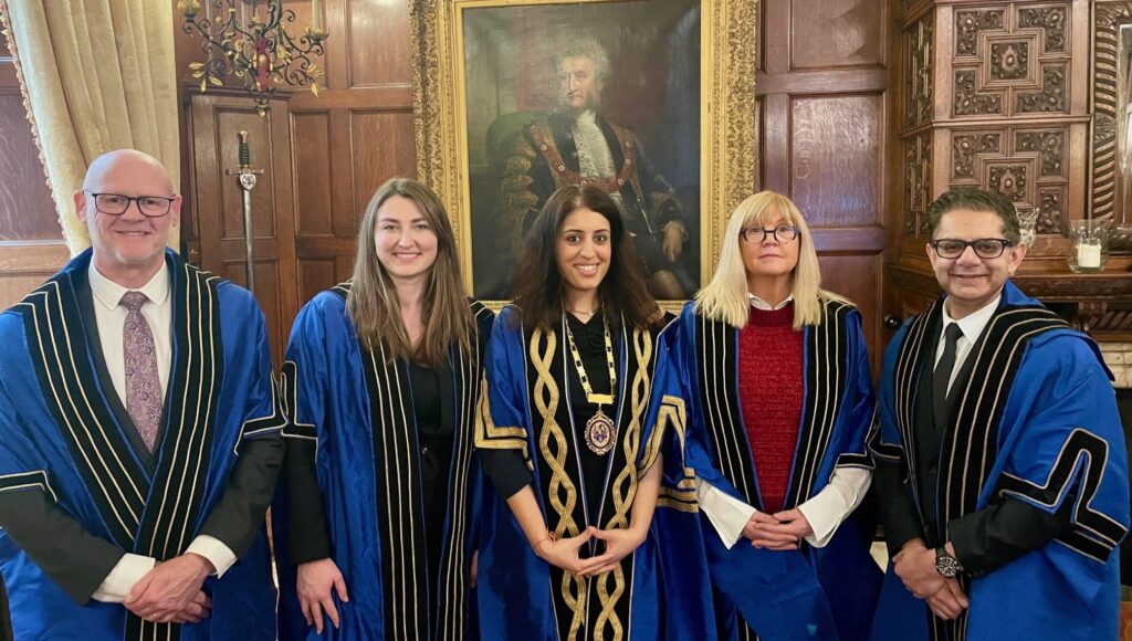 The inaugural Faculty Deans – Bill Sharpling FCGDent (left), Poppy Dunton (second from left), Dr Debbie Reed FCGDent (second from right) and Professor Avijit Banerjee FCGDent (right) – with College President Roshni Karia MCGDent (centre).
